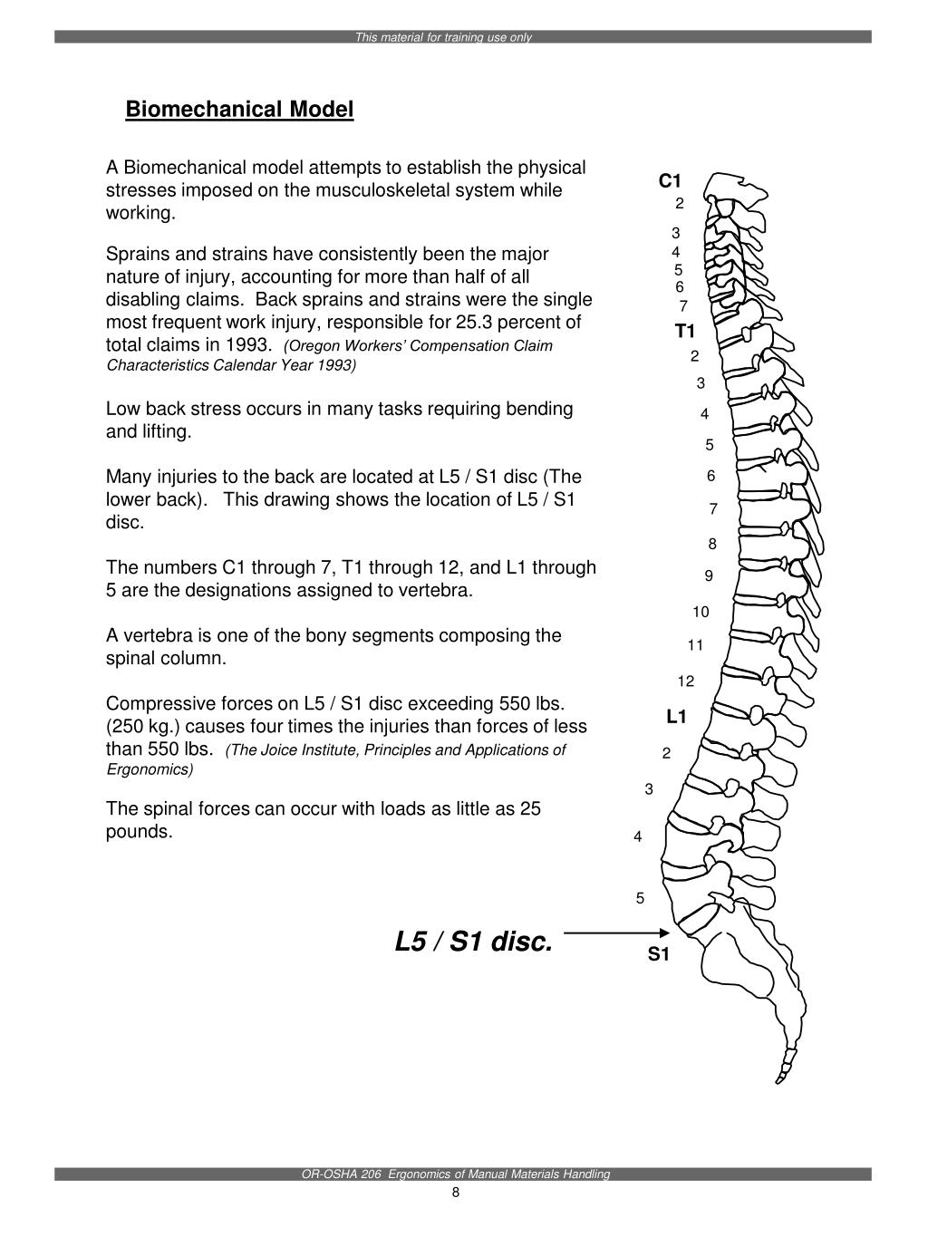 $6.00 sec. Section 1: The Costs of MMH Injuries Oregon employers spent roughly $600,000,000 on accepted disabling claims relative to soft tissue injuries in three years from 1990 thru 1992. Of the 30,741 accepted disabling claims in 1993, 55 percent were filed for sprains and strains. Over 16,900 disabling claims Back strains (7,789) were the single most frequent disabling injury. The trunk area (back, chest, hips, shoulders, and abdomen) accounted for 40.9 percent of the claims recorded in 1993. C1 2 3 4 5 6 7 T1 2 3 4 5 6 7 8 9 10 11 12 L1 2 3 4 5 Working surfaces were the leading source of injury Boxes and containers were the second most frequent sources of injury Bodily motion was third