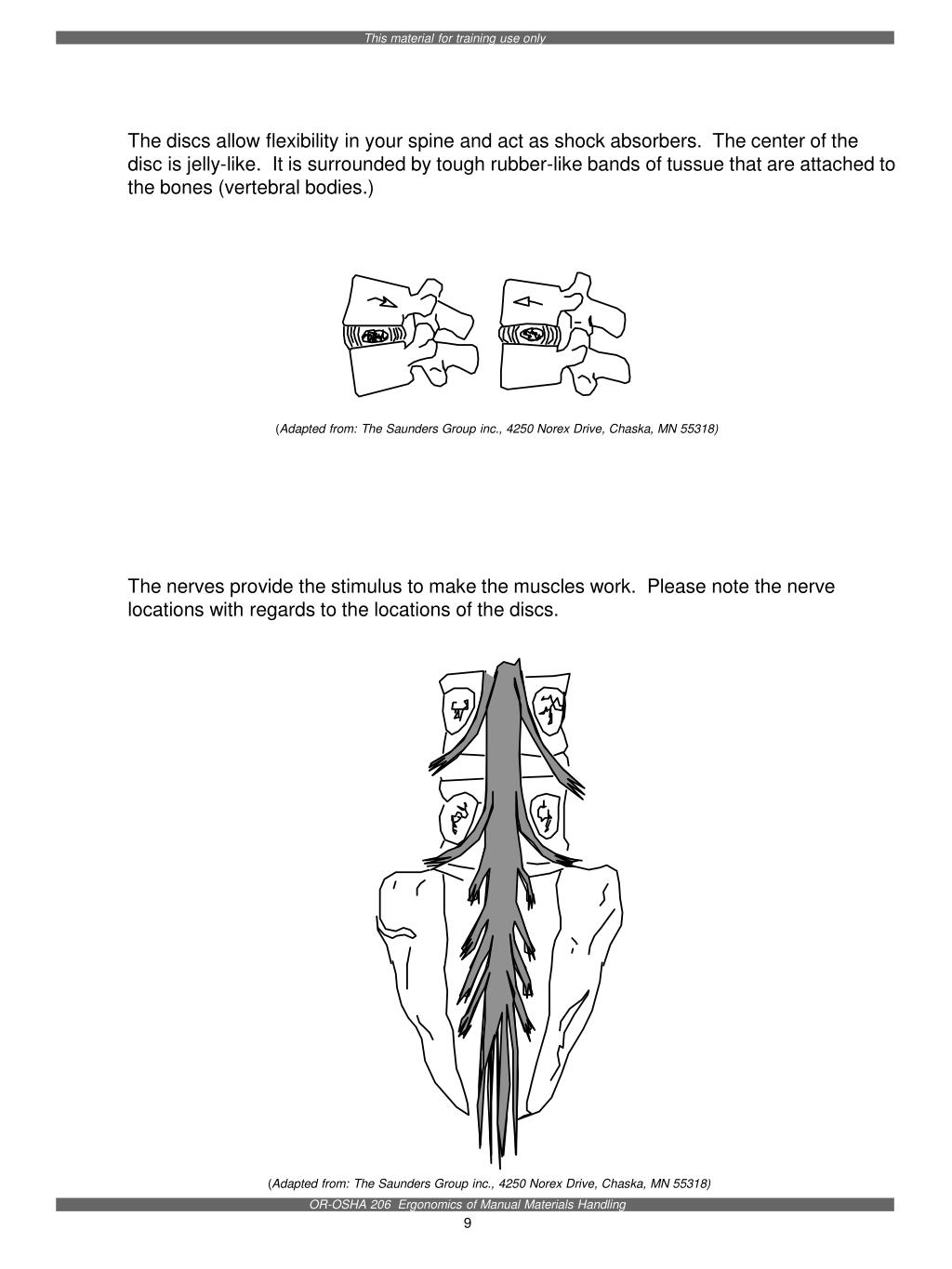 The discs allow flexibility in your spine and act as shock absorbers. The center of the disc is jelly-like. It is surrounded by tough rubber-like bands of tussue that are attached to the bones (vertebral bodies.) (Adapted from: The Saunders Group inc., 4250 Norex Drive, Chaska, MN 55318) The nerves provide the stimulus to make the muscles work. Please note the nerve locations with regards to the locations of the discs. (Adapted from: The Saunders Group inc., 4250 Norex Drive, Chaska, MN 55318)