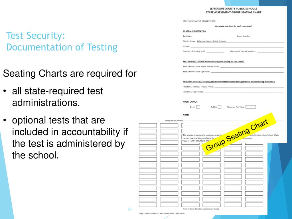 Test Security:Documentation of Testing • Seating Charts are required for • all state-required test administrations. • optional tests that are included in accountability if the test is administered by the school. Group Seating Chart
