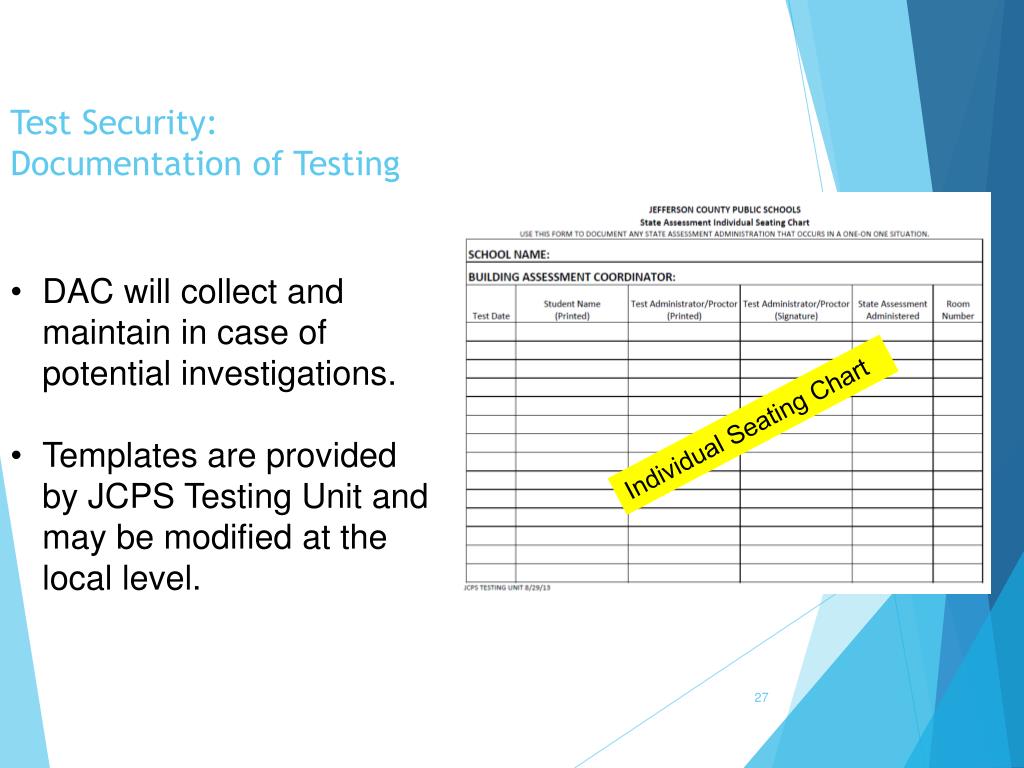 Test Security:Documentation of Testing • DAC will collect and maintain in case of potential investigations. • Templates are provided by JCPS Testing Unit and may be modified at the local level. Individual Seating Chart