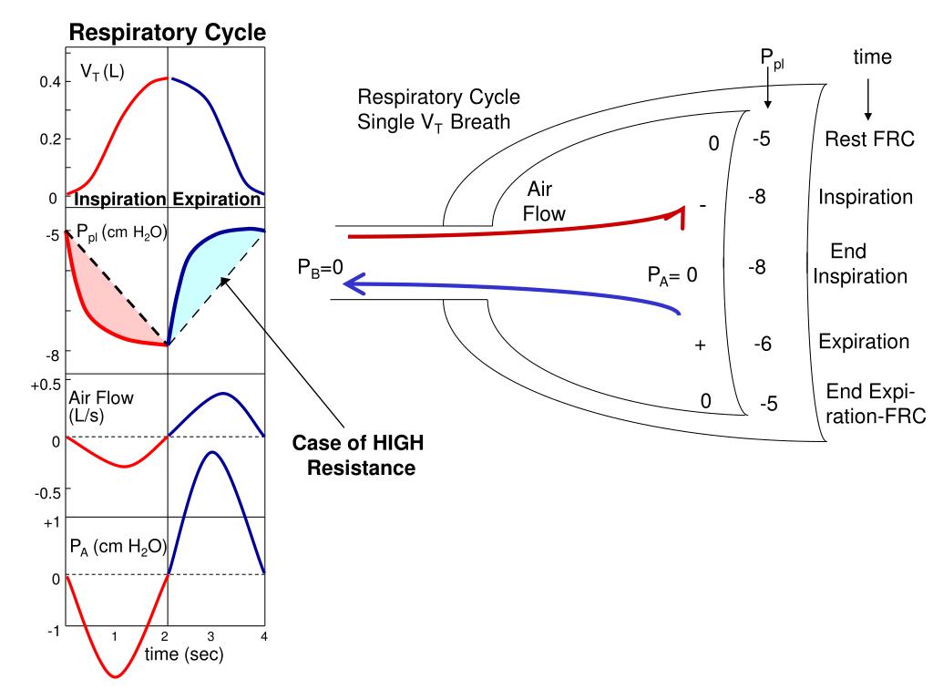 Respiratory Cycle Ppl time VT (L) 0.4 Respiratory Cycle Single VT Breath -5 Rest FRC 0.2 0 Air Flow -8 Inspiration Inspiration Expiration 0 - Ppl (cmH2O) -5 End Inspiration PB=0 -8 PA= 0 Expiration + -6 -8 +0.5 End Expi- ration-FRC 0 -5 Air Flow (L/s) Case of HIGH Resistance 0 -0.5 +1 PA (cm H2O) 0 -1 1 2 3 4 time (sec)