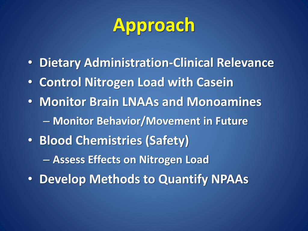 Approach • Dietary Administration-Clinical Relevance • Control Nitrogen Load with Casein • Monitor Brain LNAAs and Monoamines • Monitor Behavior/Movement in Future • Blood Chemistries (Safety) • Assess Effects on Nitrogen Load • Develop Methods to Quantify NPAAs