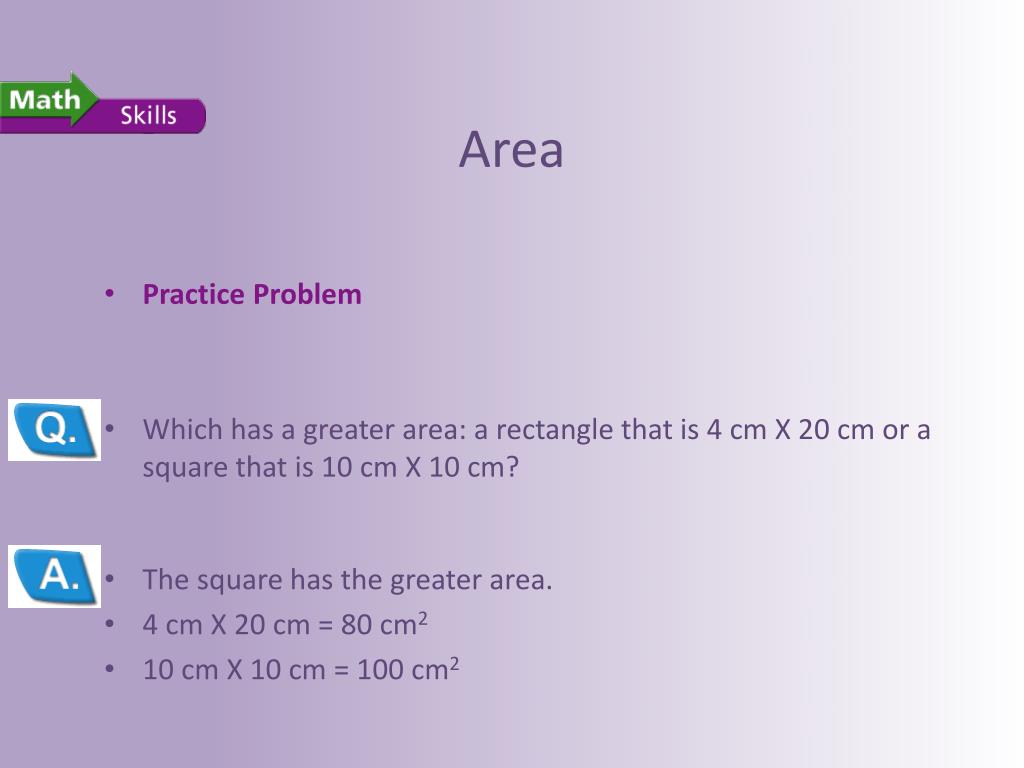 Practice Problem Which has a greater area: a rectangle that is 4 cm X 20 cm or a square that is 10 cm X 10 cm? The square has the greater area. 4 cm X 20 cm = 80 cm2 10 cm X 10 cm = 100 cm2 Area