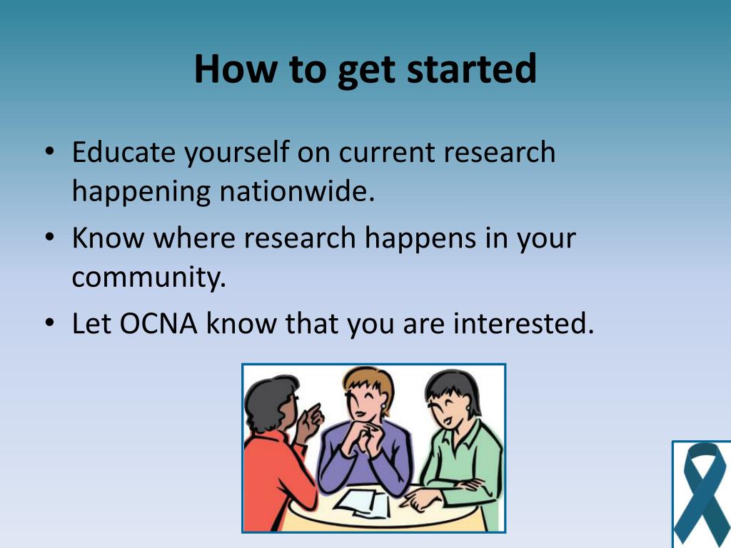 How to get started • Educate yourself on current research happening nationwide. • Know where research happens in your community. • Let OCNA know that you are interested.