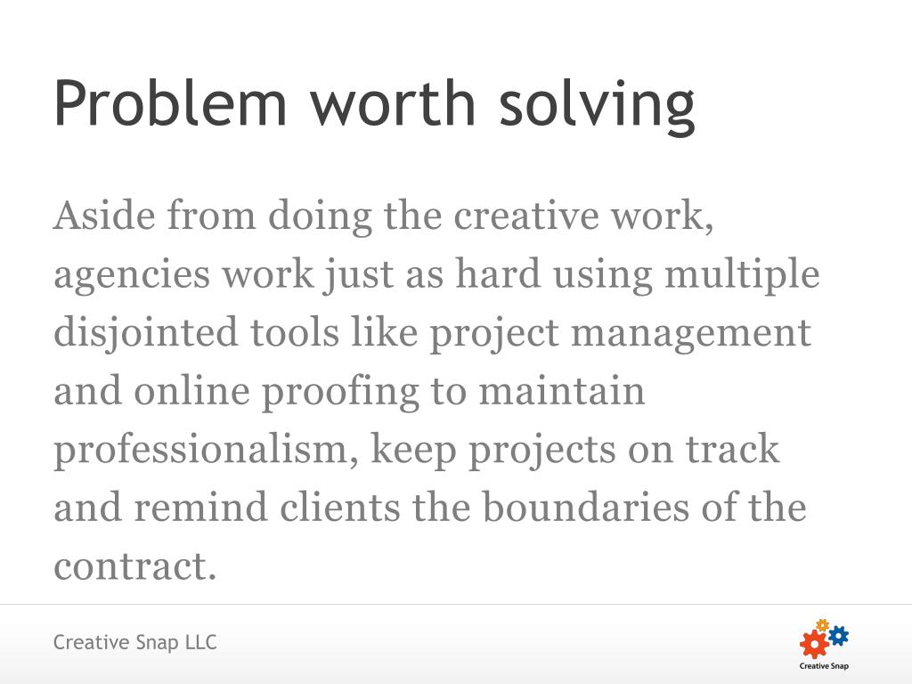 Aside from doing the creative work, agencies work just as hard using multiple disjointed tools like project management and online proofing to maintain professionalism, keep projects on track and remind clients the boundaries of the contract. Problem worth solving Creative Snap LLC