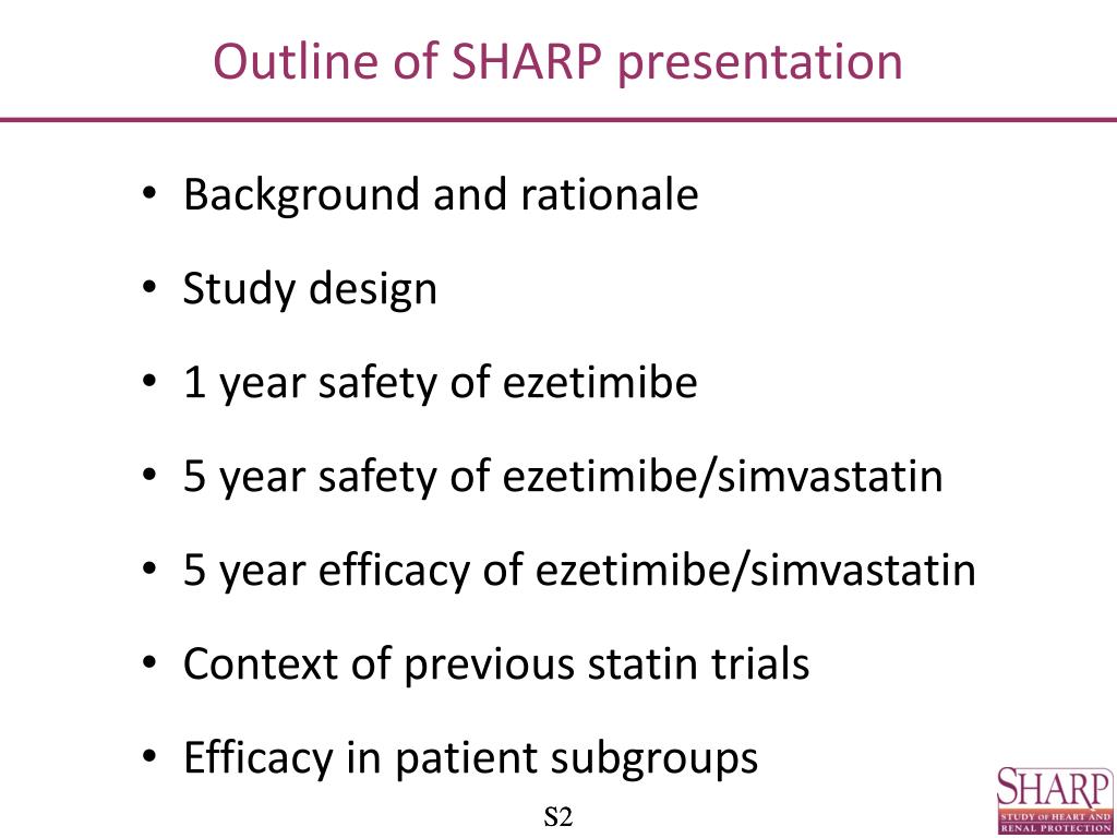 Outline of SHARP presentation Background and rationale Study design 1 year safety of ezetimibe 5 year safety of ezetimibe/simvastatin 5 year efficacy of ezetimibe/simvastatin Context of previous statin trials Efficacy in patient subgroups