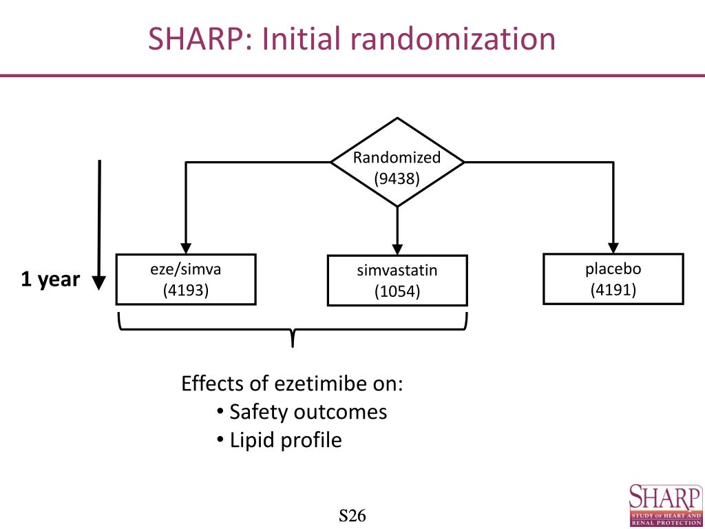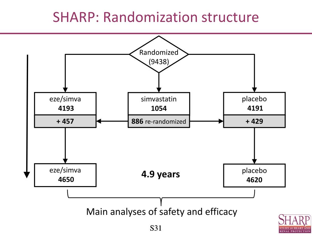 SHARP: Randomization structure Randomized (9438) placebo 4191 eze/simva 4193 simvastatin 1054 + 457 886 re-randomized + 429 eze/simva 4650 placebo 4620 4.9 years Main analyses of safety and efficacy