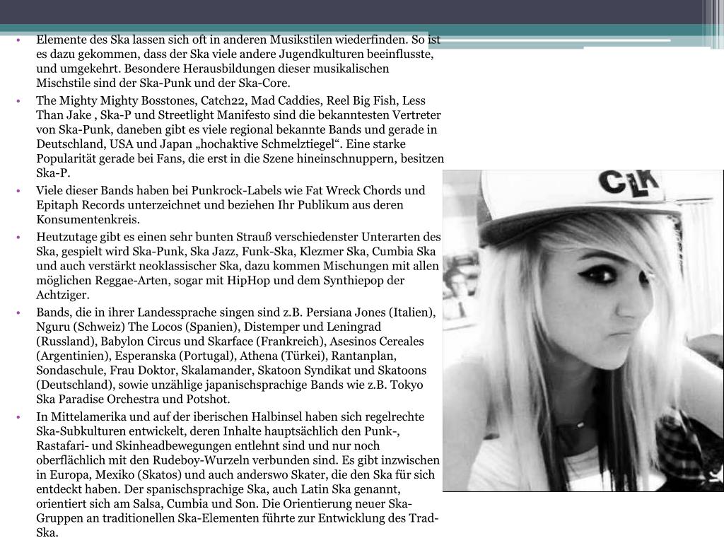 Elemente des Ska lassen sich oft in anderen Musikstilen wiederfinden. So ist es dazu gekommen, dass der Ska viele andere Jugendkulturen beeinflusste, und umgekehrt. Besondere Herausbildungen dieser musikalischen Mischstile sind der Ska-Punk und der Ska-Core. • The MightyMightyBosstones, Catch22, Mad Caddies, Reel Big Fish, LessThan Jake , Ska-P und StreetlightManifesto sind die bekanntesten Vertreter von Ska-Punk, daneben gibt es viele regional bekannte Bands und gerade in Deutschland, USA und Japan „hochaktive Schmelztiegel“. Eine starke Popularität gerade bei Fans, die erst in die Szene hineinschnuppern, besitzen Ska-P. • Viele dieser Bands haben bei Punkrock-Labels wie FatWreckChords und Epitaph Records unterzeichnet und beziehen Ihr Publikum aus deren Konsumentenkreis. • Heutzutage gibt es einen sehr bunten Strauß verschiedenster Unterarten des Ska, gespielt wird Ska-Punk, Ska Jazz, Funk-Ska, Klezmer Ska, CumbiaSka und auch verstärkt neoklassischer Ska, dazu kommen Mischungen mit allen möglichen Reggae-Arten, sogar mit HipHop und dem Synthiepop der Achtziger. • Bands, die in ihrer Landessprache singen sind z.B. Persiana Jones (Italien), Nguru (Schweiz) The Locos (Spanien), Distemper und Leningrad (Russland), Babylon Circus und Skarface (Frankreich), AsesinosCereales (Argentinien), Esperanska (Portugal), Athena (Türkei), Rantanplan, Sondaschule, Frau Doktor, Skalamander, Skatoon Syndikat und Skatoons (Deutschland), sowie unzählige japanischsprachige Bands wie z.B. Tokyo Ska Paradise Orchestra und Potshot. • In Mittelamerika und auf der iberischen Halbinsel haben sich regelrechte Ska-Subkulturen entwickelt, deren Inhalte hauptsächlich den Punk-, Rastafari- und Skinheadbewegungen entlehnt sind und nur noch oberflächlich mit den Rudeboy-Wurzeln verbunden sind. Es gibt inzwischen in Europa, Mexiko (Skatos) und auch anderswo Skater, die den Ska für sich entdeckt haben. Der spanischsprachigeSka, auch LatinSka genannt, orientiert sich am Salsa, Cumbia und Son. Die Orientierung neuer Ska-Gruppen an traditionellen Ska-Elementen führte zur Entwicklung des Trad-Ska. • Ska ist mittlerweile eine beliebte Live- und Partymusikrichtung und es hat sich eine sehr aktive und offene Subkultur gebildet. Diese zeigt sich nicht so sehr in aktuellen CD-Verkäufen, dafür sind aber immer öfter Ska-Bands im Line-Up großer Festivals zu finden, da sie wie wenig andere für sommerliche Partymusik stehen. Die dritte Welle des Ska ist außer in Südamerika selten aus der Independent-Ecke herausgekommen.