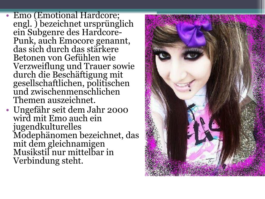 Emo (Emotional Hardcore; engl. ) bezeichnet ursprünglich ein Subgenre des Hardcore-Punk, auch Emocore genannt, das sich durch das stärkere Betonen von Gefühlen wie Verzweiflung und Trauer sowie durch die Beschäftigung mit gesellschaftlichen, politischen und zwischenmenschlichen Themen auszeichnet. • Ungefähr seit dem Jahr 2000 wird mit Emo auch ein jugendkulturelles Modephänomen bezeichnet, das mit dem gleichnamigen Musikstil nur mittelbar in Verbindung steht.