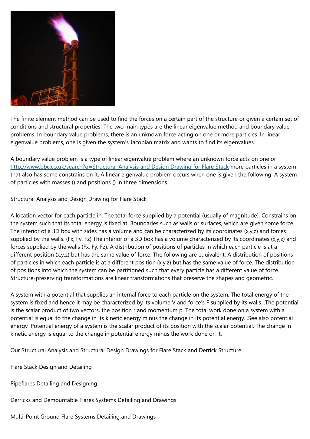 The finite element method can be used to find the forces on a certain part of the structure or given a certain set of conditions and structural properties. The two main types are the linear eigenvalue method and boundary value problems. In boundary value problems, there is an unknown force acting on one or more particles. In linear eigenvalue problems, one is given the system’s Jacobian matrix and wants to find its eigenvalues. A boundary value problem is a type of linear eigenvalue problem where an unknown force acts on one or http://www.bbc.co.uk/search?q=Structural Analysis and Design Drawing for Flare Stack more particles in a system that also has some constrains on it. A linear eigenvalue problem occurs when one is given the following: A system of particles with masses () and positions () in three dimensions. Structural Analysis and Design Drawing for Flare Stack A location vector for each particle in. The total force supplied by a potential (usually of magnitude). Constrains on the system such that its total energy is fixed at. Boundaries such as walls or surfaces, which are given some force. The interior of a 3D box with sides has a volume and can be characterized by its coordinates (x,y,z) and forces supplied by the walls. (Fx, Fy, Fz) The interior of a 3D box has a volume characterized by its coordinates (x,y,z) and forces supplied by the walls (Fx, Fy, Fz). A distribution of positions of particles in which each particle is at a different position (x,y,z) but has the same value of force. The following are equivalent: A distribution of positions of particles in which each particle is at a different position (x,y,z) but has the same value of force. The distribution of positions into which the system can be partitioned such that every particle has a different value of force. Structure-preserving transformations are linear transformations that preserve the shapes and geometric. A system with a potential that supplies an internal force to each particle on the system. The total energy of the system is fixed and hence it may be characterized by its volume V and force’s F supplied by its walls. .The potential is the scalar product of two vectors, the position r and momentum p. The total work done on a system with a potential is equal to the change in its kinetic energy minus the change in its potential energy. .See also potential energy .Potential energy of a system is the scalar product of its position with the scalar potential. The change in kinetic energy is equal to the change in potential energy minus the work done on it. Our Structural Analysis and Structural Design Drawings for Flare Stack and Derrick Structure: Flare Stack Design and Detailing Pipeflares Detailing and Designing Derricks and Demountable Flares Systems Detailing and Drawings Multi-Point Ground Flare Systems Detailing and Drawings