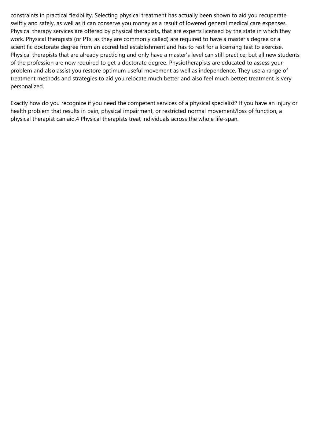 constraints in practical flexibility. Selecting physical treatment has actually been shown to aid you recuperate swiftly and safely, as well as it can conserve you money as a result of lowered general medical care expenses. Physical therapy services are offered by physical therapists, that are experts licensed by the state in which they work. Physical therapists (or PTs, as they are commonly called) are required to have a master's degree or a scientific doctorate degree from an accredited establishment and has to rest for a licensing test to exercise. Physical therapists that are already practicing and only have a master's level can still practice, but all new students of the profession are now required to get a doctorate degree. Physiotherapists are educated to assess your problem and also assist you restore optimum useful movement as well as independence. They use a range of treatment methods and strategies to aid you relocate much better and also feel much better; treatment is very personalized. Exactly how do you recognize if you need the competent services of a physical specialist? If you have an injury or health problem that results in pain, physical impairment, or restricted normal movement/loss of function, a physical therapist can aid.4 Physical therapists treat individuals across the whole life-span.