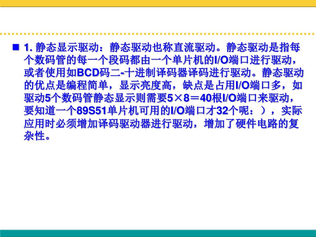 1. 静态显示驱动:静态驱动也称直流驱动。静态驱动是指每个数码管的每一个段码都由一个单片机的I/O端口进行驱动,或者使用如BCD码二-十进制译码器译码进行驱动。静态驱动的优点是编程简单,显示亮度高,缺点是占用I/O端口多,如驱动5个数码管静态显示则需要5×8=40根I/O端口来驱动,要知道一个89S51单片机可用的I/O端口才32个呢:),实际应用时必须增加译码驱动器进行驱动,增加了硬件电路的复杂性。
