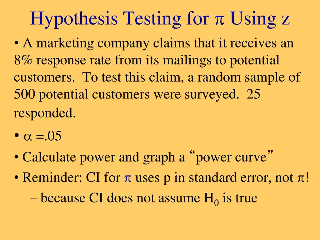 Hypothesis Testing for  Using z A marketing company claims that it receives an 8% response rate from its mailings to potential customers. To test this claim, a random sample of 500 potential customers were surveyed. 25 responded.  =.05 Calculate power and graph a “power curve” Reminder: CI for  uses p in standard error, not ! because CI does not assume H0 is true