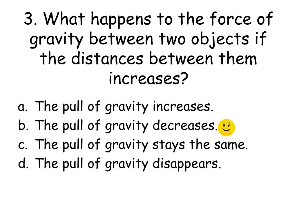 3. What happens to the force of gravity between two objects if the distances between them increases? • The pull of gravity increases. • The pull of gravity decreases. • The pull of gravity stays the same. • The pull of gravity disappears.