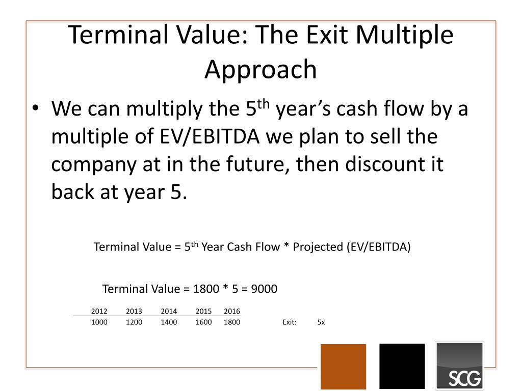 Terminal Value: The Exit Multiple Approach • We can multiply the 5th year’s cash flow by a multiple of EV/EBITDA we plan to sell the company at in the future, then discount it back at year 5. Terminal Value = 5th Year Cash Flow * Projected (EV/EBITDA) Terminal Value = 1800 * 5 = 9000