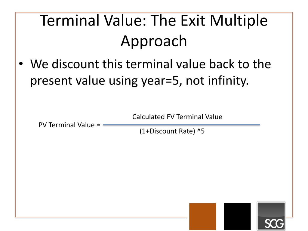 Terminal Value: The Exit Multiple Approach • We discount this terminal value back to the present value using year=5, not infinity. Calculated FV Terminal Value PV Terminal Value = (1+Discount Rate) ^5