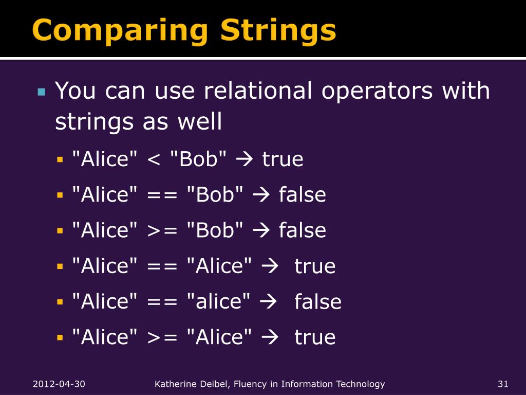 Comparing Strings • You can use relational operators with strings as well • "Alice" < "Bob" true • "Alice" == "Bob" false • "Alice" >= "Bob" false • "Alice" == "Alice" • "Alice" == "alice" • "Alice" >= "Alice" • true • false • true Katherine Deibel, Fluency in Information Technology