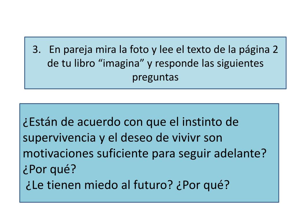 3. En parejamira la foto y lee el texto de la página 2 de tulibro “imagina” y respondelassiguientespreguntas ¿Están de acuerdo con que el instinto de supervivencia y el deseo de vivivr son motivacionessuficienteparaseguiradelante? ¿Porqué? ¿Le tienenmiedo al futuro? ¿Porqué?