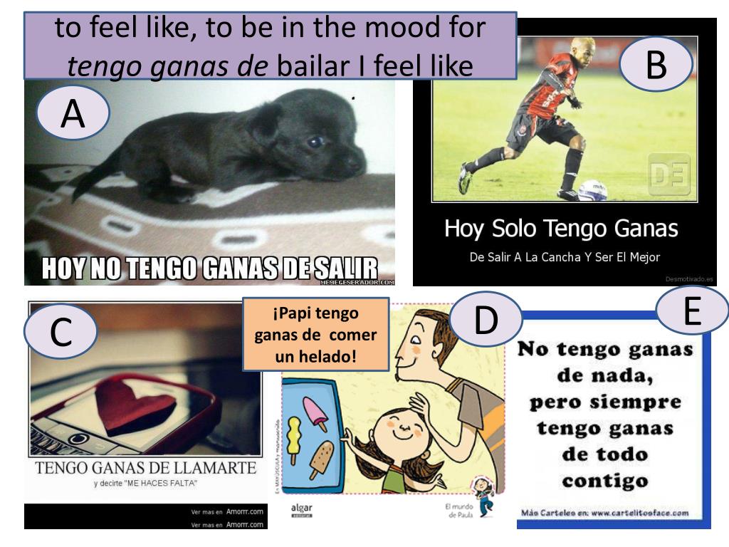 to feel like, to be in the mood for tengoganas debailar I feel like B A E D ¡Papitengoganas de comer un helado! C