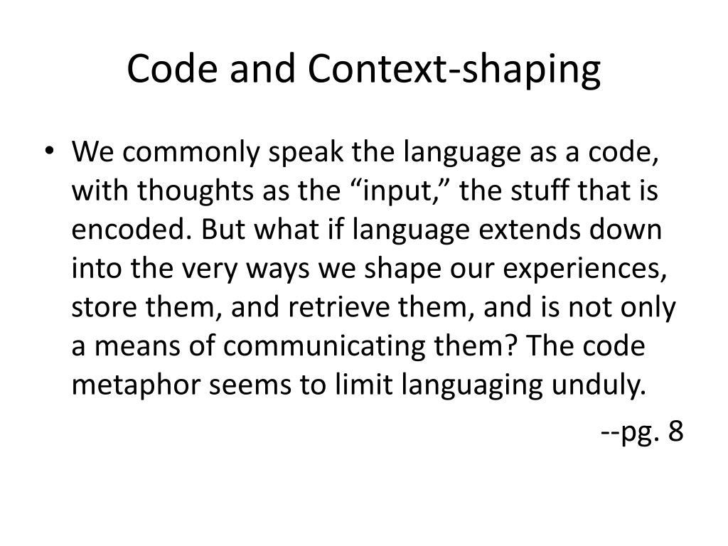 Code and Context-shaping • We commonly speak the language as a code, with thoughts as the “input,” the stuff that is encoded. But what if language extends down into the very ways we shape our experiences, store them, and retrieve them, and is not only a means of communicating them? The code metaphor seems to limit languaging unduly. --pg. 8