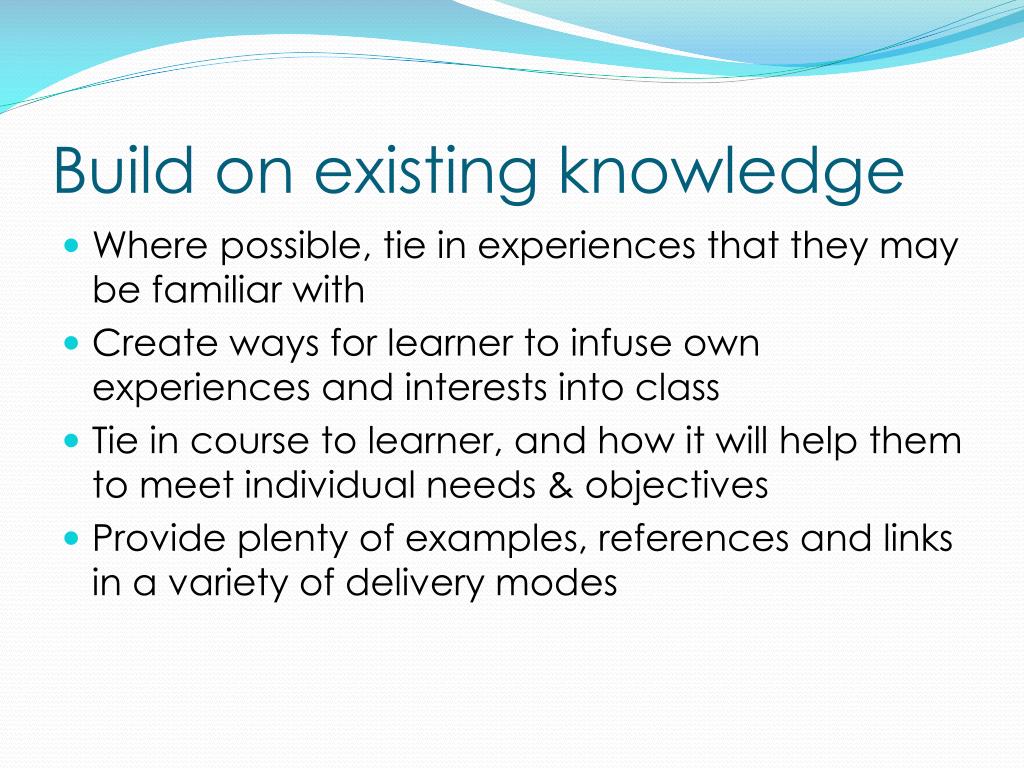 Build on existing knowledge • Where possible, tie in experiences that they may be familiar with • Create ways for learner to infuse own experiences and interests into class • Tie in course to learner, and how it will help them to meet individual needs & objectives • Provide plenty of examples, references and links in a variety of delivery modes