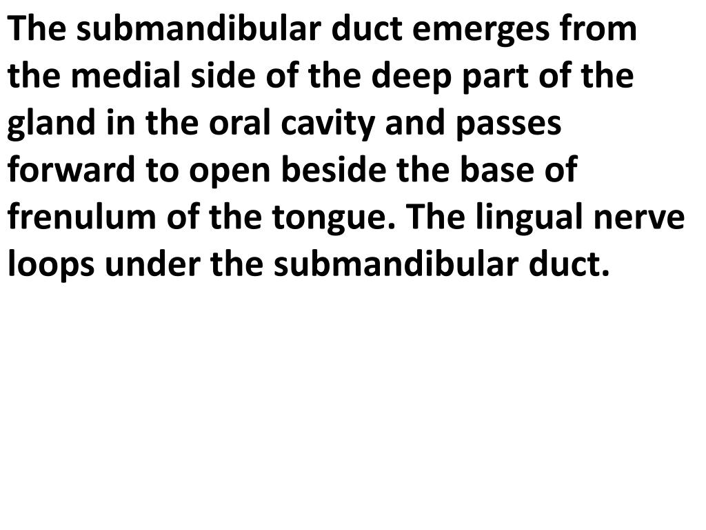 The submandibular duct emerges from the medial side of the deep part of the gland in the oral cavity and passes forward to open beside the base of frenulum of the tongue. The lingual nerve loops under the submandibular duct.