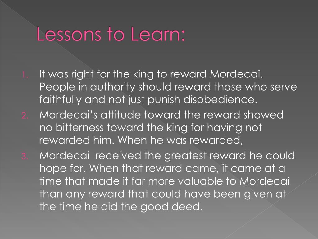 Lessons to Learn: • It was right for the king to reward Mordecai. People in authority should reward those who serve faithfully and not just punish disobedience. • Mordecai’s attitude toward the reward showed no bitterness toward the king for having not rewarded him. When he was rewarded, • Mordecai received the greatest reward he could hope for. When that reward came, it came at a time that made it far more valuable to Mordecai than any reward that could have been given at the time he did the good deed.