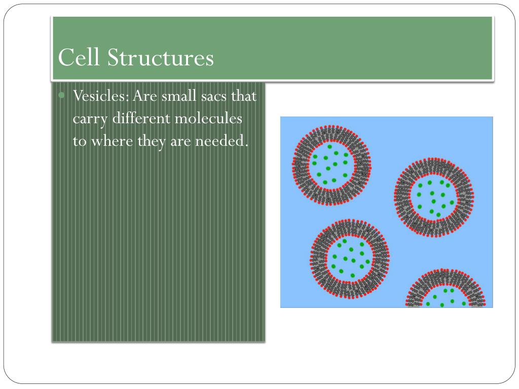 Cell Structures • Vesicles: Are small sacs that carry different molecules to where they are needed.
