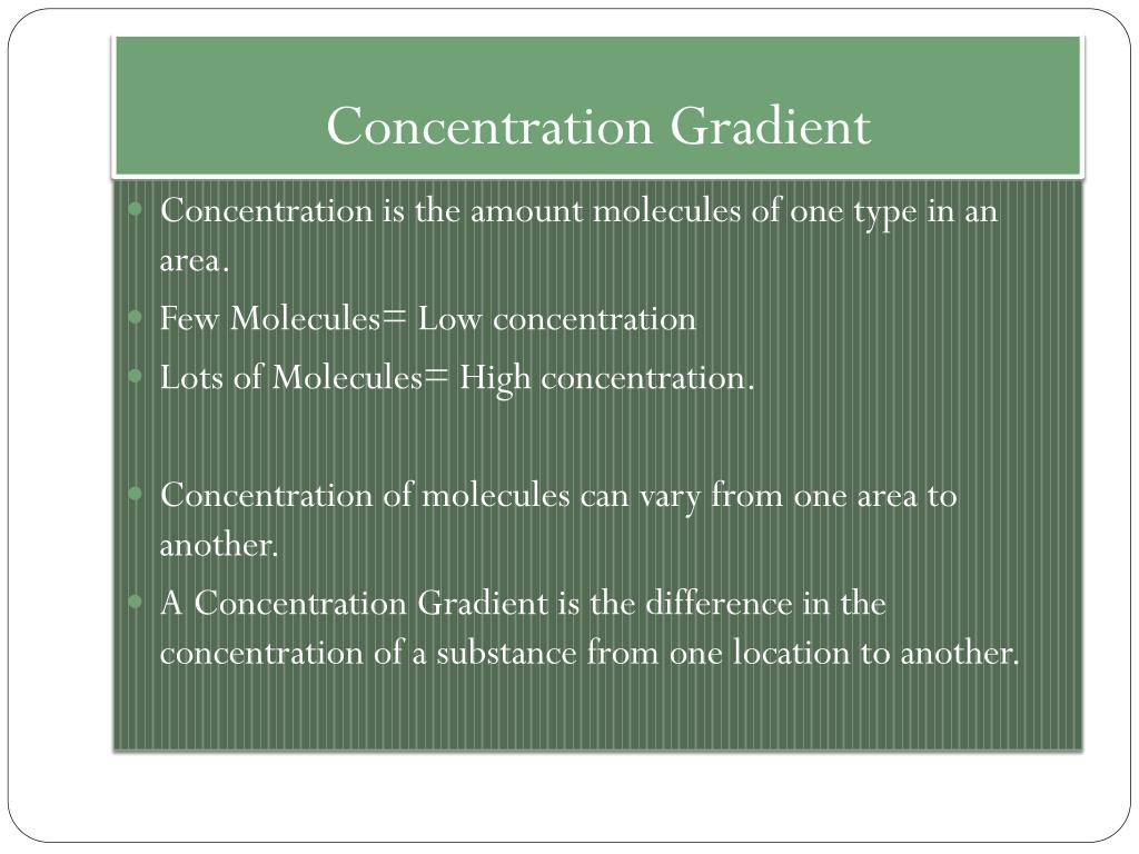 Concentration Gradient • Concentration is the amount molecules of one type in an area. • Few Molecules= Low concentration • Lots of Molecules= High concentration. • Concentration of molecules can vary from one area to another. • A Concentration Gradient is the difference in the concentration of a substance from one location to another.