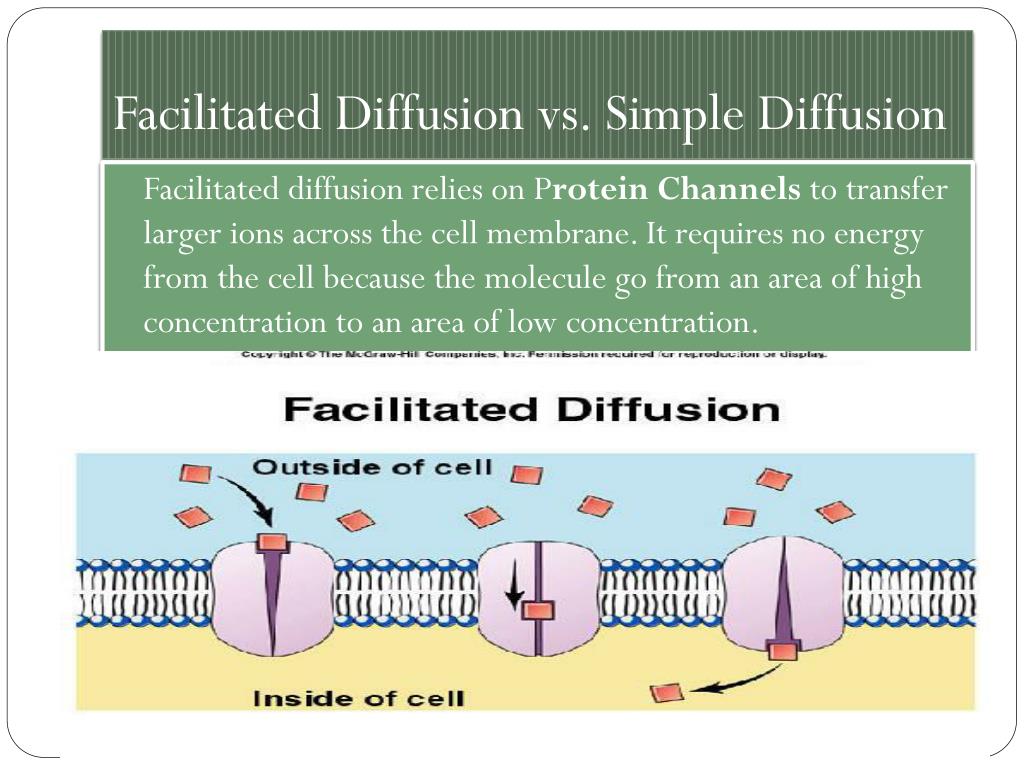 Facilitated Diffusion vs. Simple Diffusion • Facilitated diffusion relies on Protein Channels to transfer larger ions across the cell membrane. It requires no energy from the cell because the molecule go from an area of high concentration to an area of low concentration.