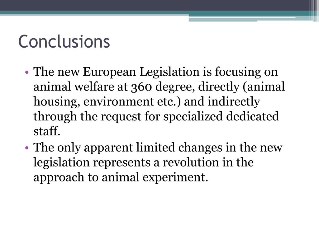 Conclusions • The newEuropeanLegislation is focusing on animal welfare at 360 degree, directly (animal housing, environment etc.) and indirectlythrough the requestforspecializeddedicated staff. • The onlyapparentlimitedchanges in the newlegislationrepresents a revolution in the approach to animal experiment.
