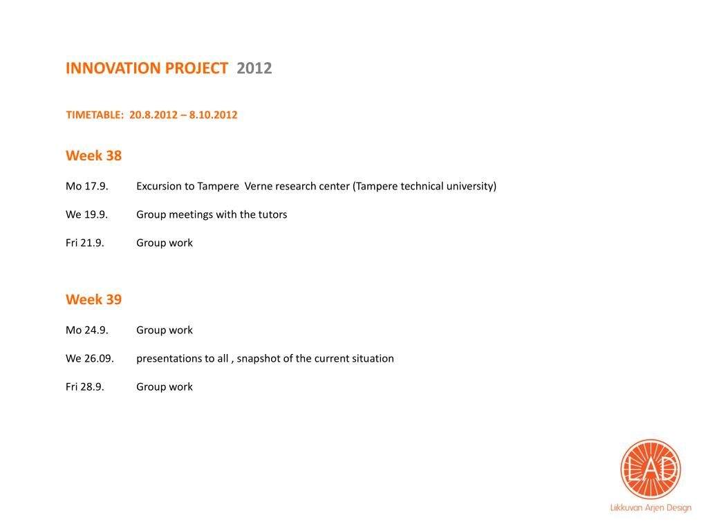 INNOVATION PROJECT2012 TIMETABLE: 20.8.2012 – 8.10.2012 Week 38 Mo 17.9. Excursion to Tampere Verne research center (Tampere technical university) We 19.9. Group meetings with the tutors Fri 21.9. Group work Week 39 Mo 24.9. Group work We 26.09. presentations to all , snapshot of the current situation Fri 28.9. Group work