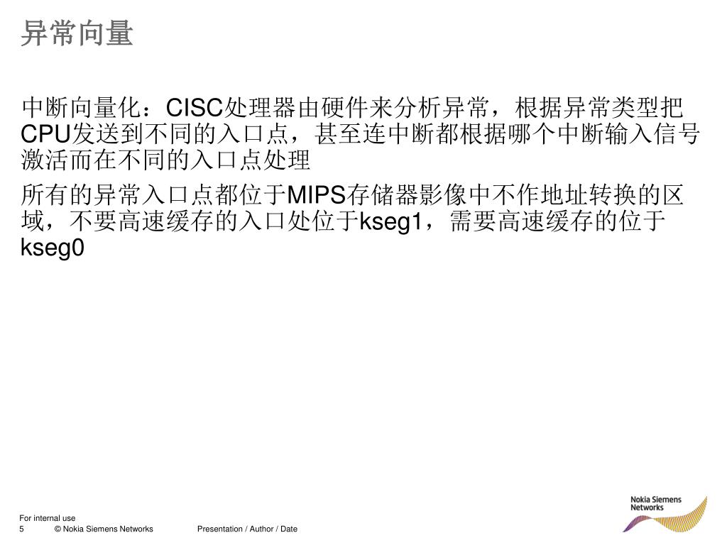 异常向量 • 中断向量化:CISC处理器由硬件来分析异常,根据异常类型把CPU发送到不同的入口点,甚至连中断都根据哪个中断输入信号激活而在不同的入口点处理 • 所有的异常入口点都位于MIPS存储器影像中不作地址转换的区域,不要高速缓存的入口处位于kseg1,需要高速缓存的位于kseg0
