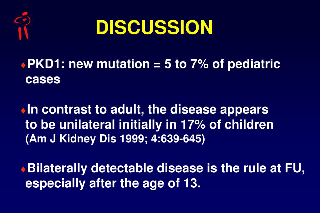 DISCUSSION • PKD1: new mutation = 5 to 7% of pediatric cases • In contrast to adult, the disease appearsto be unilateral initially in 17% of children(Am J Kidney Dis 1999; 4:639-645) • Bilaterally detectable disease is the rule at FU, especially after the age of 13.