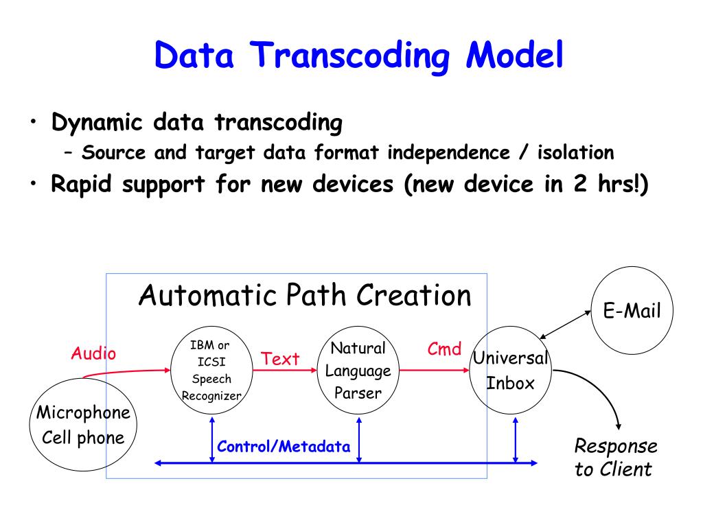 IBM or ICSI Speech Recognizer Natural Language Parser Text Control/Metadata Data Transcoding Model • Dynamic data transcoding • Source and target data format independence / isolation • Rapid support for new devices (new device in 2 hrs!) E-Mail Automatic Path Creation Universal Inbox Cmd Audio Microphone Cell phone Response to Client