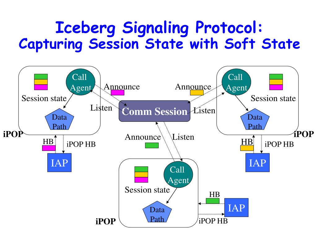 Announce Announce Listen Listen Data Path Data Path Announce Listen HB HB iPOP HB iPOP HB HB Data Path Iceberg Signaling Protocol: Capturing Session State with Soft State Call Agent Call Agent Session state Session state Comm Session iPOP iPOP IAP IAP Call Agent Session state IAP iPOP iPOP HB