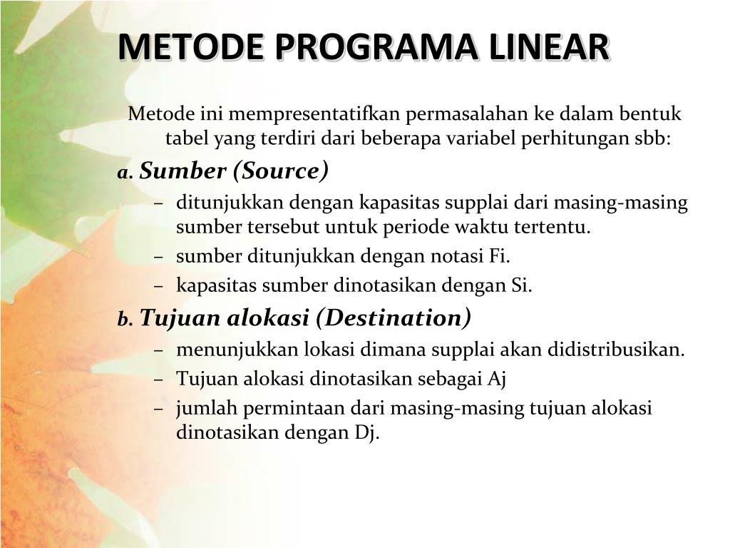 METODE PROGRAMA LINEAR Metode ini mempresentatifkan permasalahan kedalam bentuk tabel yang terdiri dari beberapa variabel perhitungan sbb: a. Sumber (Source) • ditunjukkan dengan kapasitas supplai dari masing-masing sumber tersebut untuk periode waktu tertentu. • sumber ditunjukkan dengan notasi Fi. • kapasitas sumber dinotasikan dengan Si. b. Tujuan alokasi (Destination) • menunjukkan lokasi dimana supplai akan didistribusikan. • Tujuan alokasi dinotasikan sebagai Aj • jumlah permintaan dari masing-masing tujuan alokasi dinotasikan dengan Dj.