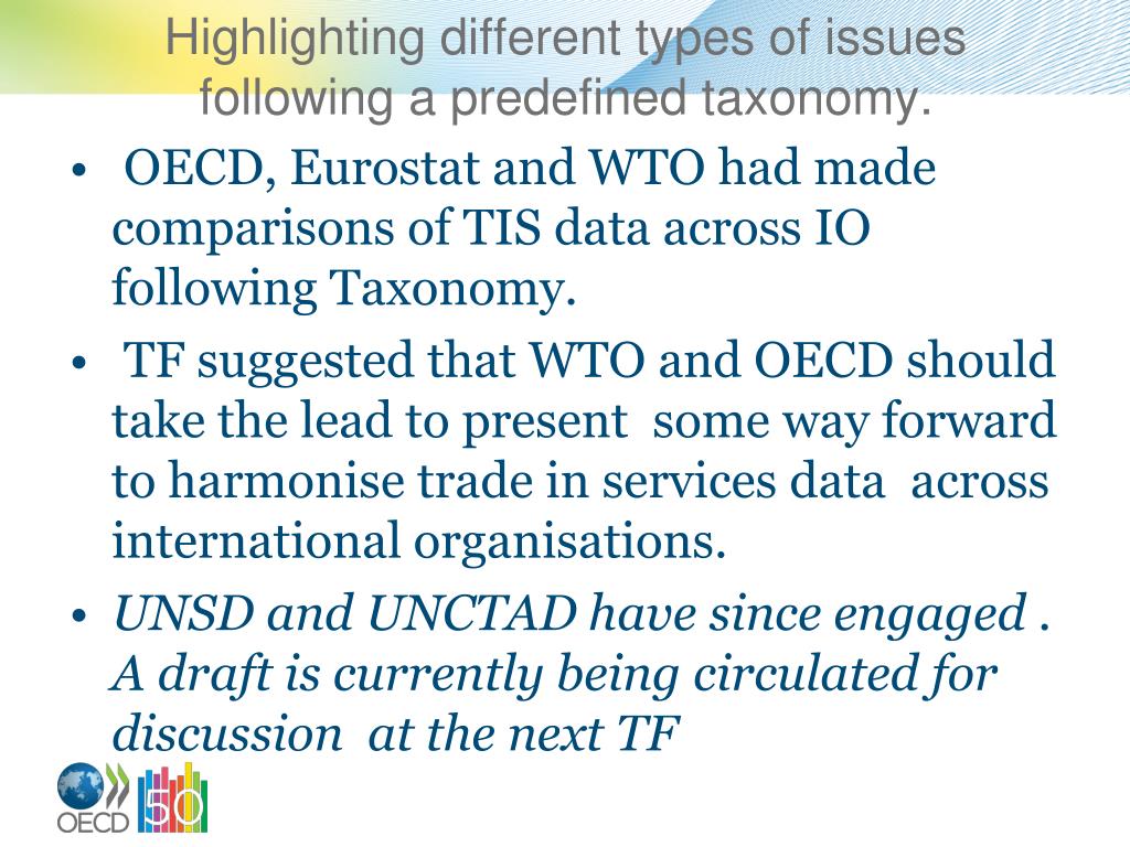 Highlighting different types of issues following a predefined taxonomy. • OECD, Eurostat and WTO had made comparisons of TIS data across IO following Taxonomy. • TF suggested that WTO and OECD should take the lead to present some way forward to harmonise trade in services data across international organisations. • UNSD and UNCTAD have since engaged . A draft is currently being circulated for discussion at the next TF