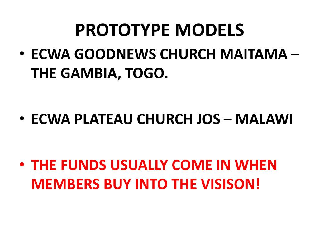PROTOTYPE MODELS • ECWA GOODNEWS CHURCH MAITAMA – THE GAMBIA, TOGO. • ECWA PLATEAU CHURCH JOS – MALAWI • THE FUNDS USUALLY COME IN WHEN MEMBERS BUY INTO THE VISISON!