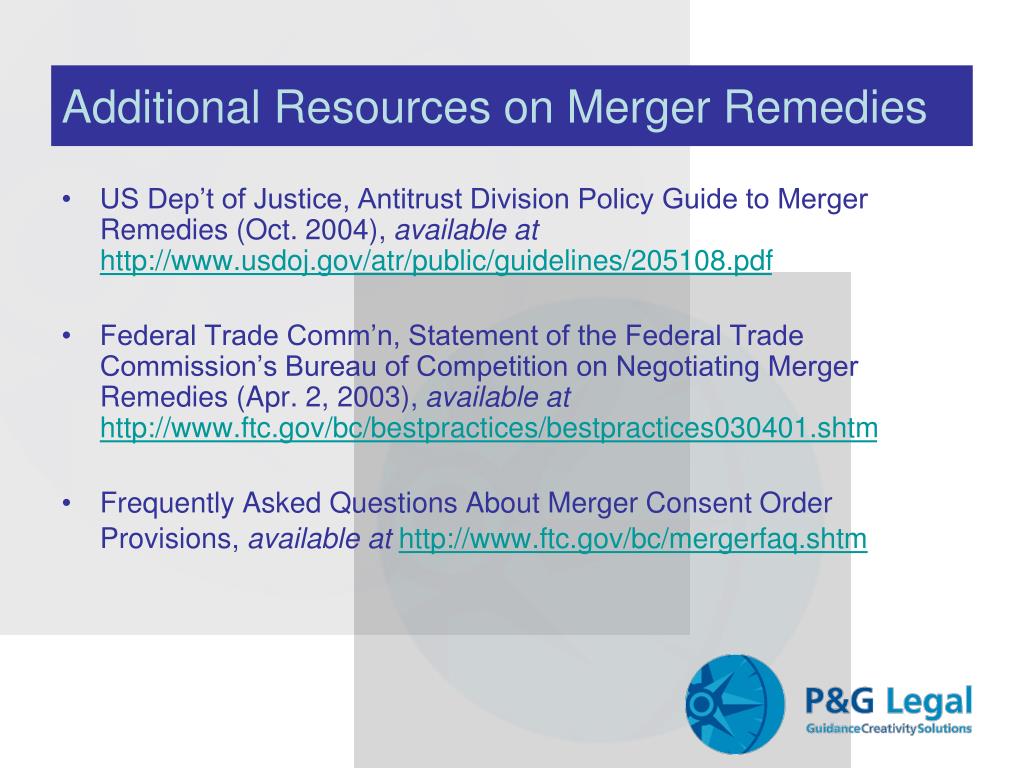 Additional Resources on Merger Remedies • US Dep’t of Justice, Antitrust Division Policy Guide to Merger Remedies (Oct. 2004), available athttp://www.usdoj.gov/atr/public/guidelines/205108.pdf • Federal Trade Comm’n, Statement of the Federal Trade Commission’s Bureau of Competition on Negotiating Merger Remedies (Apr. 2, 2003), available athttp://www.ftc.gov/bc/bestpractices/bestpractices030401.shtm • Frequently Asked Questions About Merger Consent Order Provisions, available athttp://www.ftc.gov/bc/mergerfaq.shtm