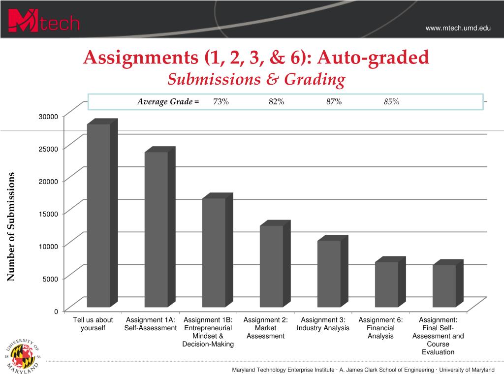 Assignments (1, 2, 3, & 6): Auto-gradedSubmissions & Grading AverageGrade = 73% 82% 87% 85% Number of Submissions Maryland Technology Enterprise Institute · A. James Clark School of Engineering · University of Maryland
