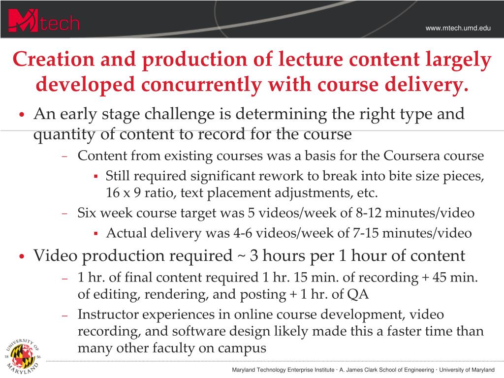 Creation and production of lecture content largely developed concurrently with course delivery. • An early stage challenge is determining the right type and quantity of content to record for the course • Content from existing courses was a basis for the Coursera course • Still required significant rework to break into bite size pieces, 16 x 9 ratio, text placement adjustments, etc. • Six week course target was 5 videos/week of 8-12 minutes/video • Actual delivery was 4-6 videos/week of 7-15 minutes/video • Video production required ~ 3 hours per 1 hour of content • 1 hr. of final content required 1 hr. 15 min. of recording + 45 min. of editing, rendering, and posting + 1 hr. of QA • Instructor experiences in online course development, video recording, and software design likely made this a faster time than many other faculty on campus Maryland Technology Enterprise Institute · A. James Clark School of Engineering · University of Maryland