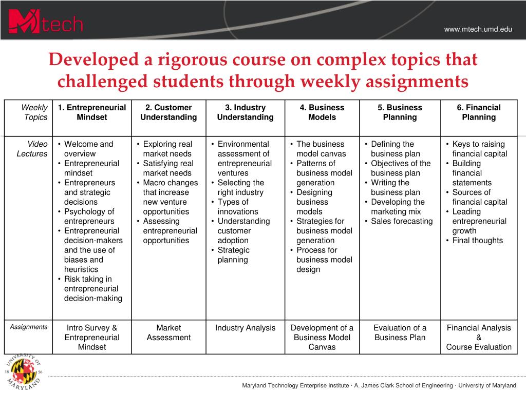 Initial student profile for our course (r =26,600, 30%) 48% First entrepreneurship course 18% Taken at least one entrepreneurship course in the past 17% Written a business plan 17% Started my own business Maryland Technology Enterprise Institute · A. James Clark School of Engineering · University of Maryland