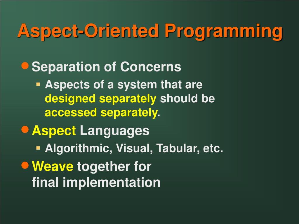 Aspect-Oriented Programming • Separation of Concerns • Aspects of a system that are designed separately should be accessed separately. • Aspect Languages • Algorithmic, Visual, Tabular, etc. • Weave together forfinal implementation