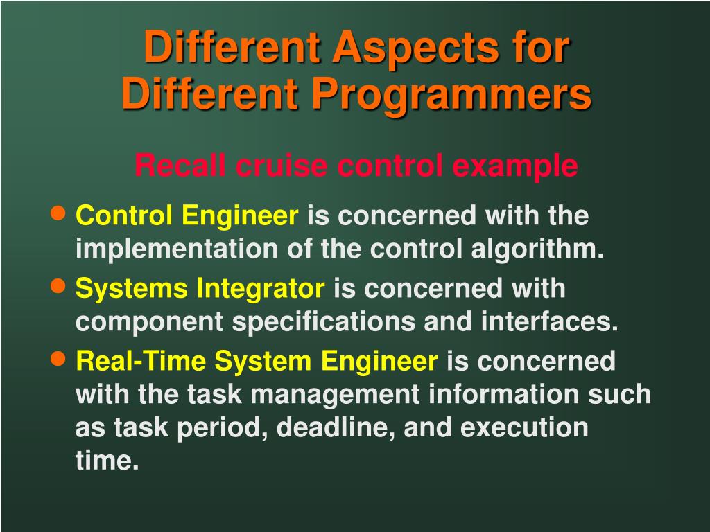 Different Aspects for Different Programmers • Control Engineer is concerned with the implementation of the control algorithm. • Systems Integrator is concerned with component specifications and interfaces. • Real-Time System Engineer is concerned with the task management information such as task period, deadline, and execution time. Recall cruise control example