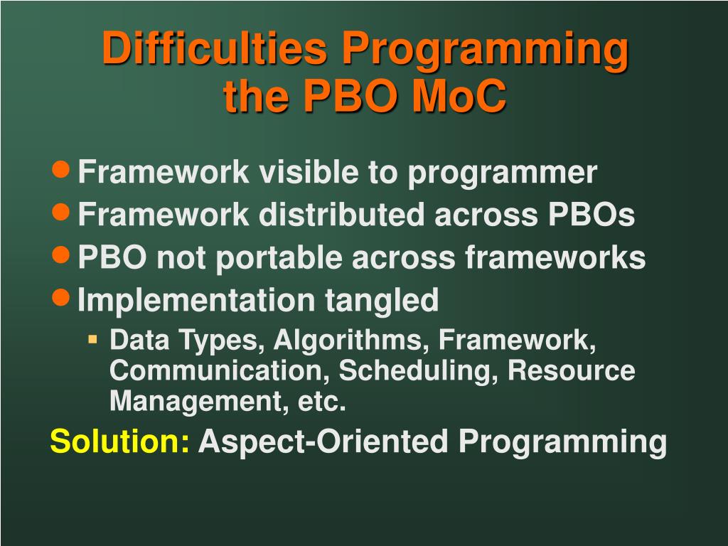 Difficulties Programming the PBO MoC • Framework visible to programmer • Framework distributed across PBOs • PBO not portable across frameworks • Implementation tangled • Data Types, Algorithms, Framework, Communication, Scheduling, Resource Management, etc. Solution: Aspect-Oriented Programming