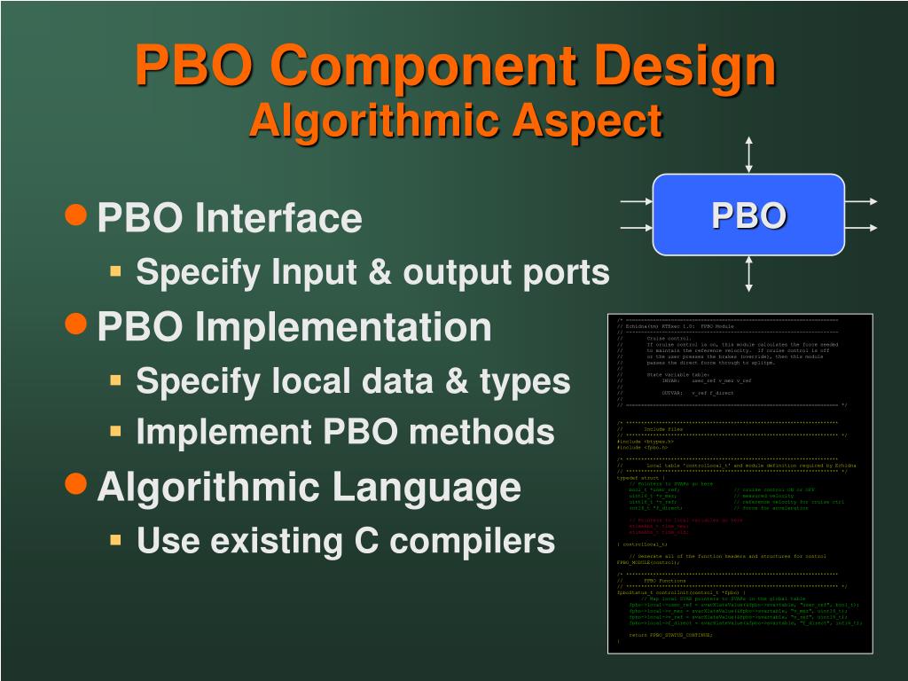 PBO PBO Component DesignAlgorithmic Aspect • PBO Interface • Specify Input & output ports • PBO Implementation • Specify local data & types • Implement PBO methods • Algorithmic Language • Use existing C compilers /* =======================================================================// Echidna(tm) RTExec 1.0: FPBO Module// -----------------------------------------------------------------------// Cruise control.// If cruise control is on, this module calculates the force needed// to maintain the reference velocity. If cruise control is off// or the user presses the brakes (override), then this module// passes the direct force through to splitpm.//// State variable table:// INVAR: user_ref v_mez v_ref//// OUTVAR: v_ref f_direct//// ======================================================================= *//* *********************************************************************** // Include files// *********************************************************************** */#include <btypes.h>#include <fpbo.h>/* *********************************************************************** // Local table 'controlLocal_t' and module definition required by Echidna// *********************************************************************** */typedef struct { // Pointers to SVARs go here bool_t *user_ref; // cruise control ON or OFF uint16_t *v_mez; // measured velocity uint16_t *v_ref; // reference velocity for cruise ctrl int16_t *f_direct; // force for acceleration // Pointers to local variables go here etimeAbs_t time_new; etimeAbs_t time_old;} controlLocal_t; // Generate all of the function headers and structures for controlFPBO_MODULE(control);/* *********************************************************************** // FPBO Functions// *********************************************************************** */fpboStatus_t controlInit(control_t *fpbo) { // Map local SVAR pointers to SVARs in the global table fpbo->local->user_ref = svarXlateValue(&fpbo->svartable, "user_ref", bool_t); fpbo->local->v_mez = svarXlateValue(&fpbo->svartable, "v_mez", uint16_t); fpbo->local->v_ref = svarXlateValue(&fpbo->svartable, "v_ref", uint16_t); fpbo->local->f_direct = svarXlateValue(&fpbo->svartable, "f_direct", int16_t); return FPBO_STATUS_CONTINUE;}