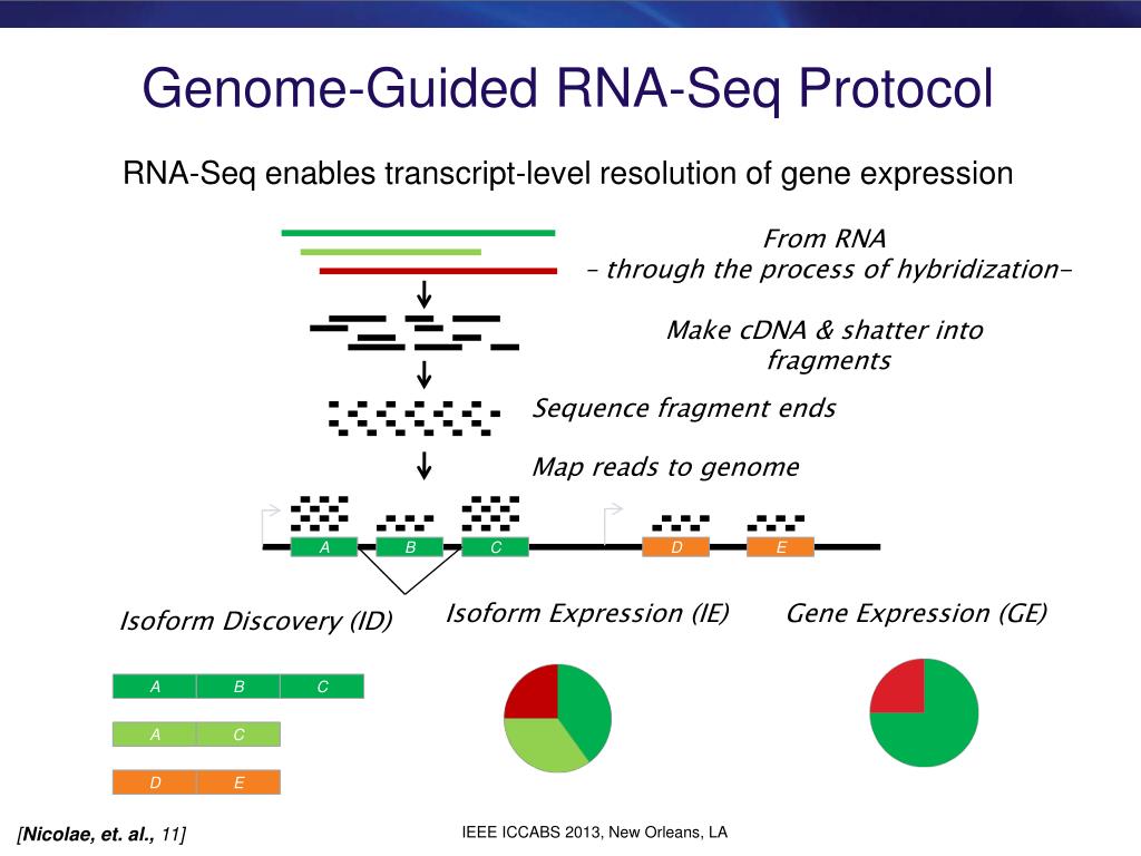 Genome-Guided RNA-Seq ProtocolRNA-Seq enables transcript-level resolution of gene expression From RNA – through the process of hybridization- Make cDNA & shatter into fragments Sequence fragment ends Map reads to genome A B C D E Isoform Expression (IE) Isoform Discovery (ID) Gene Expression (GE) A B C A C D E IEEE ICCABS 2013, New Orleans, LA [Nicolae, et. al., 11]