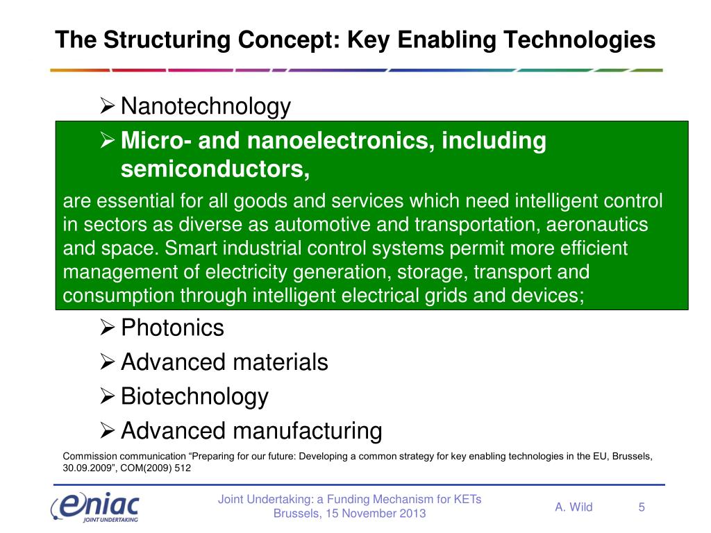 The Structuring Concept: Key Enabling Technologies • Nanotechnology • Micro- and nanoelectronics, including semiconductors, are essential for all goods and serviceswhich need intelligent control in sectors as diverse as automotive and transportation, aeronauticsand space. Smart industrial control systems permit more efficient management of electricitygeneration, storage, transport and consumption through intelligent electrical grids and devices; • Photonics • Advanced materials • Biotechnology • Advanced manufacturing Commission communication “Preparing for our future: Developing a common strategy for key enabling technologies in the EU, Brussels, 30.09.2009”, COM(2009) 512