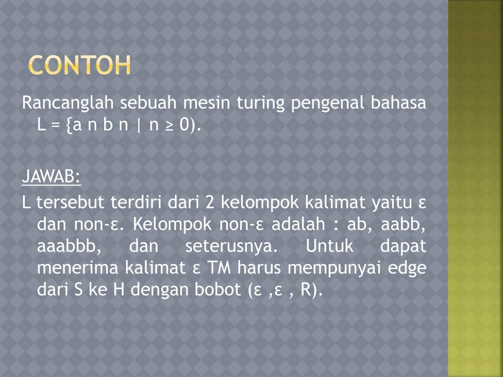 CONTOH Rancanglahsebuahmesinturingpengenalbahasa L = {a n b n | n ≥ 0). JAWAB: L tersebutterdiridari 2 kelompokkalimatyaituε dan non-ε. Kelompok non-ε adalah : ab, aabb, aaabbb, danseterusnya. Untukdapatmenerimakalimatε TM harusmempunyaiedge dari S ke H dengan bobot (ε ,ε , R).